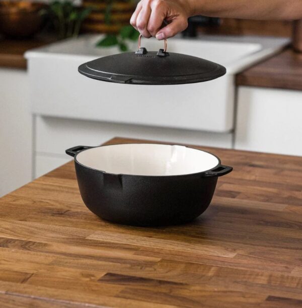 De Enamel Lined Crock Pot is gemaakt van gietijzer. Hierdoor wordt de warmte in de pan goed vastgehouden. De pan bevat een emaille laag. Deze laag zorgt voor een glad en antikleef effect. Daarnaast heeft de Enamel Lined Crock Pot ook een anti-aanbaklaag. Deze laag is bestand tegen vlekken en als er sprake is van vlekken dan ook weer makkelijk schoon te maken.