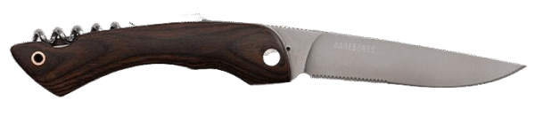 Het Barebones Folding Picnic Knife is een unieke combinatie van gebruiksgemak en draagbaarheid. Het heeft een 4-inch mes met halve tanden, een wijnsleutel, een kurkentrekker en een flesopener.