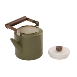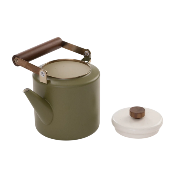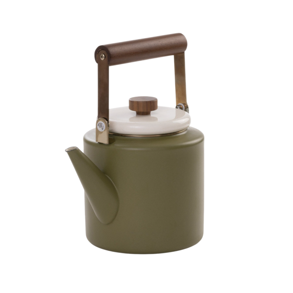 De tweekleurige geëmailleerde waterkoker heeft een mooi, dik walnoothouten handvat en trekdop, een gespikkelde witte deksel en een olijfgroene behuizing. Hij is geschikt voor het zetten van thee, het opwarmen van cocktails, het sudderen van bouillon en het koken van water voor warme chocolademelk en koffie.